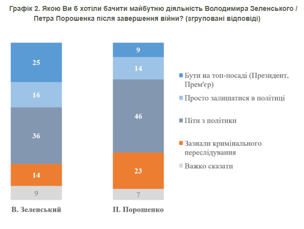 Несмотря на сохранение высокого уровня поддержки, только 41% респондентов считают, что Зеленскому следует оставаться в политике после войны, а только 25% хотели бы, чтобы он продолжил быть президентом. 36% опрошенных считают, что ему лучше уйти из политики, а 14% поддерживают идею его уголовного преследования.